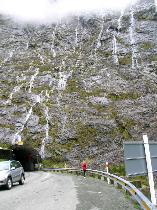 | The Homer tunnel on the road to Milford with water cascading down the cliff face. |