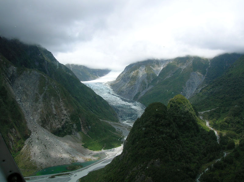 Fox glacier from the air as the clouds start to form.