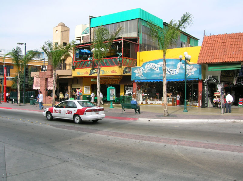 | Tijuana's Avenue Revolucion (between 1st and 8th) - an eclectic mix of cultural statues, markets and exotic dancers. And a taxi. |